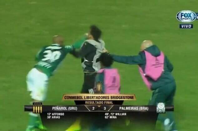 帕尔梅拉斯门将普拉斯(蓝衣者)被五六名佩纳罗尔球员围住。